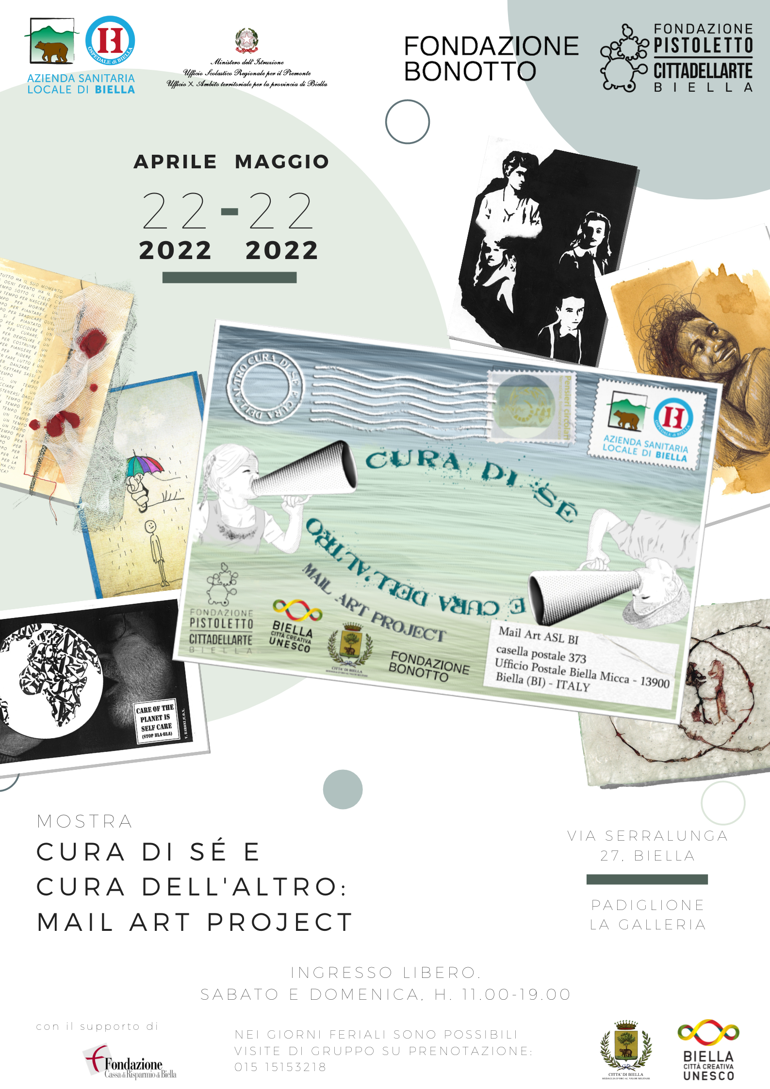 Le opere realizzate dagli studenti delle superiori e degli artisti che hanno partecipato al progetto “Cura di sé e cura dell`altro: Mail Art Project”, sono in esposizione dal 22 aprile fino al 22 maggio nelle sale della Fondazione Pistoletto – Cittadellarte, partner del progetto insieme alla Fondazione Bonotto, punto di riferimento nazionale per quanto riguarda l’arte verbo-visiva, sonora, performativa ed elettronica.
